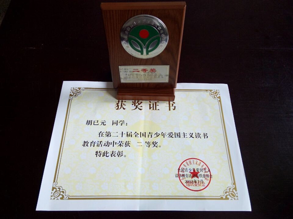 胡已元同學(xué)在第十二屆全國青少年愛國主義讀書教育活動中榮獲二等獎。